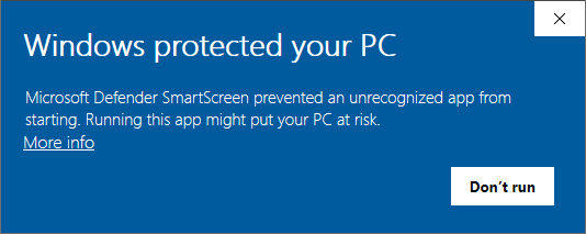 If you get a warning like this when you run the game, it's rubbish. Click “More info → Run anyway.” to continue. If you don't feel comfortable doing that, try the Steam version instead.